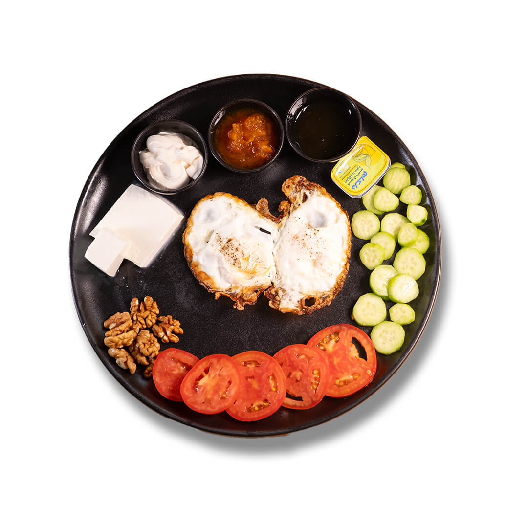 حجم غذا:2 عدد تخم مرغ +کره+مربا+عسل+خامه+گردو+خیار+گوجه