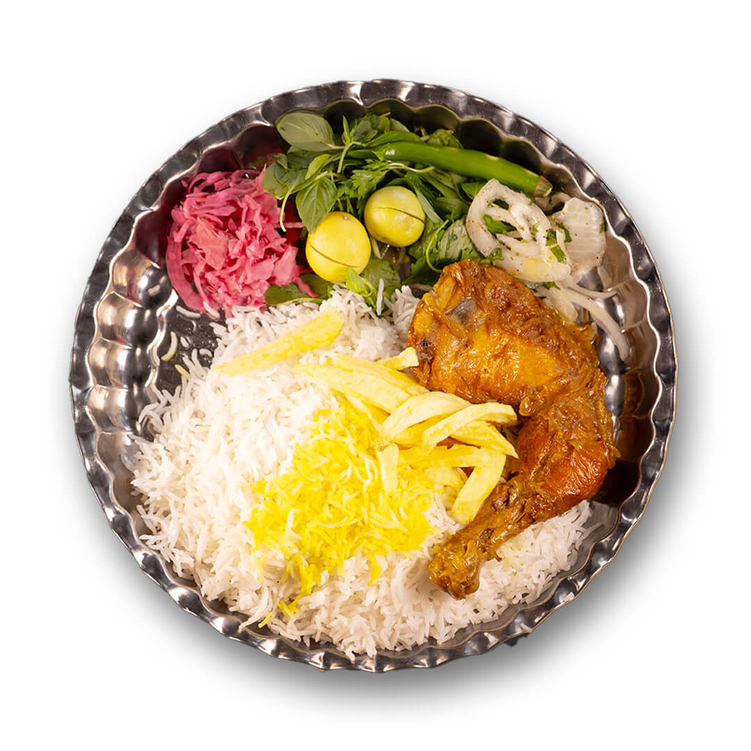 حجم غذا: ران 300 الی 350 گرمی با پیاز و زعفران عمل آوری شده + 350 گرم برنج پاکستانی + دورچین