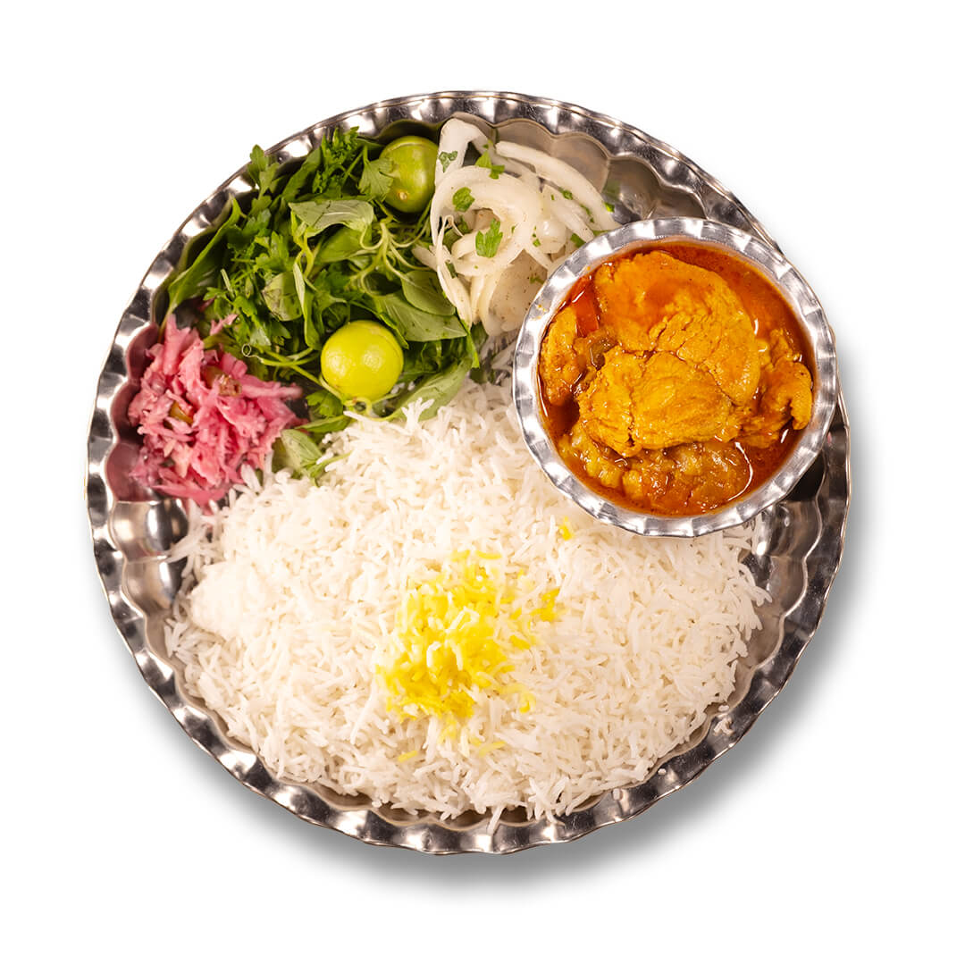 حجم غذا: 250 گرم خورشت بادمجان+100 گرم شنسل مرغ پخته شده+350 گرم برنج پاکستانی +دورچین