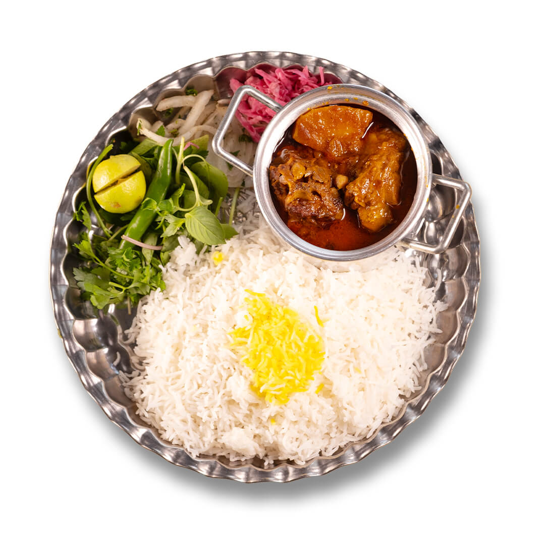 حجم غذا:250 گرم خورشت+130 گرم گوشت پخته شده کهره + 350 گرم برنج پاکستانی+دورچین